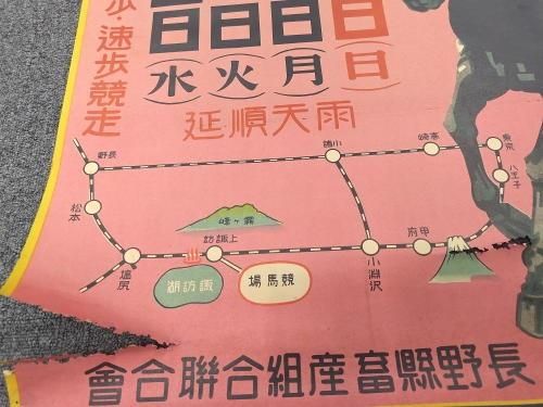 「上諏訪競馬/五月九日(日)十日(月)十一日(火)十二日(水) 雨天順延/障害・駈歩・速歩競走/新宿駅より四時間風光明媚の温泉郷/主催 長野縣畜産組合聯合會」